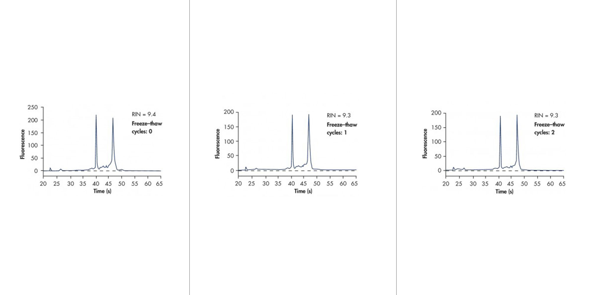 Bone marrow samples were stabilized in PAXgene Bone Marrow RNA Tubes, and RNA was purified using the PAXgene Bone Marrow RNA Kit after the indicated number of freeze–thaw cycles. The RIN scores did not change significantly, indicating that RNA remained intact in the samples up to two (2) freeze–thaw cycles.