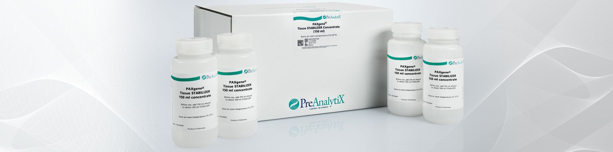 The PAXgene Tissue STABILIZER Concentrate is intended for the stabilization and storage of tissue specimens. This stabilizing agent is intended to be used as part of the PAXgene Tissue System and must be used in conjuction with the PAXgene Tissue FIX Container (see Procedure below). The PAXgene Tissue System additionally includes the PAXgene Tissue RNA/miRNA Kit for the isolation of total RNA, including miRNA, and the PAXgene Tissue DNA Kit for DNA. Supplementary protocols are available for other applications, including purification of proteins.